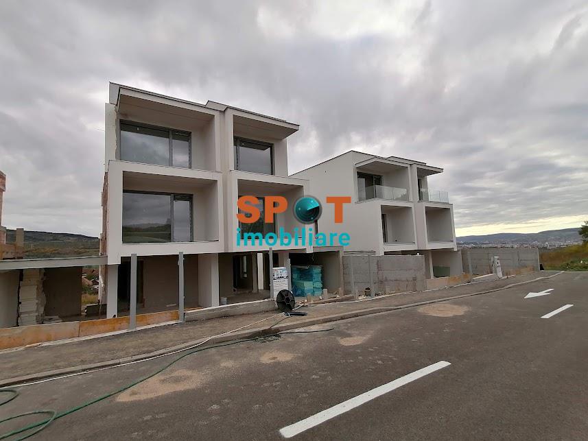 SPOT Imobiliare recomanda spre vanzare vila tip duplex in zona Borhanci - Cluj-Napoca, avand 4 camere, 3 dormitoare, suprafata totala construita 222 mp, suprafata utila 145 mp si suprafata teren 308 mp. Imobilul are amprenta 111 mp, curtea individuala, teren in proprietate libera cca 200 mp. Are structura din beton, este construita in anul 2022, constructie din caramida cemacon, avand peretii dintre case din caramida izolata fonic cu vata bazaltica, 3 bai, 1 bucatarie si 5 terase.Compartimentare casa: la subsol - beci; parter: spatiu tehnic, bucatarie, hol, baie; etaj: living cu acces la terasa, dormitor cu terasa, baie, dressing; etaj retras: 2 dormitoare cu acces pe terase, baie, dressing. Dotari : acoperis: terasa; bucatarie: da, nemobilata, deschisa; calorifere: nu; ferestre casa: term. pvc Rehau synego 7 camere cu sticla tripan; incalzire casa: centrala termica, incalzire pardoseala; izolatii termice: exterior; mobilat: nemobilat; pereti: glet; plansee: beton; podele: sapa; structura casa: caramida; tip curte: individuala, teren in proprietate. Curtea se preda imprejmuita cu gard, porti metalice cu actionare electrica, videointerfon, gazon cu sistem de irigatie, sistem de degivrare, copaci decorativi. La geamuri vor fi instalate rulouri exterioare de aluminiu. Garajul este de 39 mp, pentru doua masini, va avea instalata priza electrica pentru masina. Pretabil locuinta. ID intern: SPT37